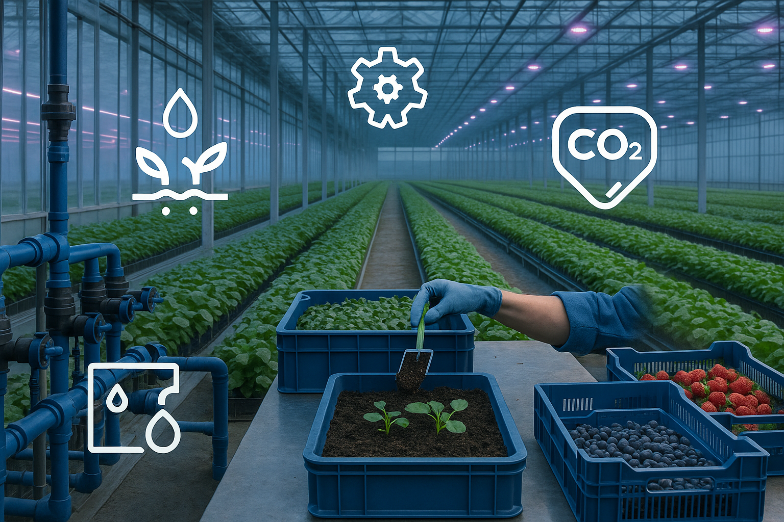 A. Биовыращивание и живые системы1. Биовыращивание (теплицы/ягодники) → рассадные, высев/пикировка/пересадка, рецептурная фертигация, полив/дозирование, микроклимат (отопление/охлаждение/вентиляция, экраны), CO₂‑дозирование, искусственное освещение, сбор.