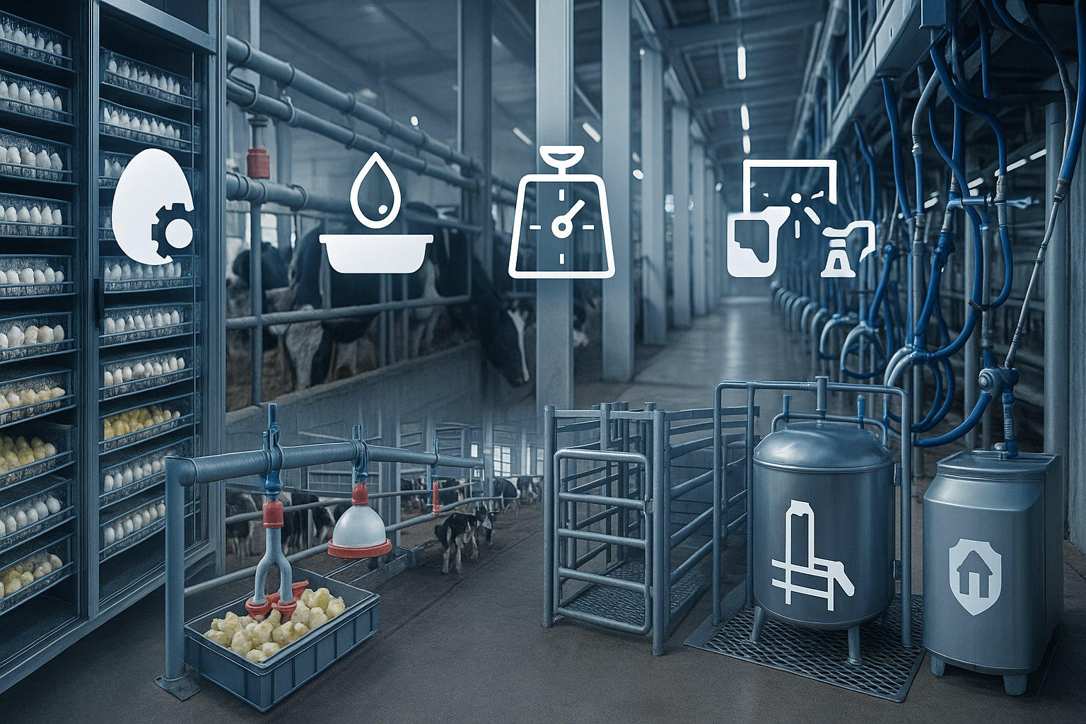 2. Животноводство (фермы) → инкубация/вывод (птица), кормление/поение (дозаторы), взвешивание/сортировка, доение/предохлаждение, санитарные операции, предубойная подготовка.