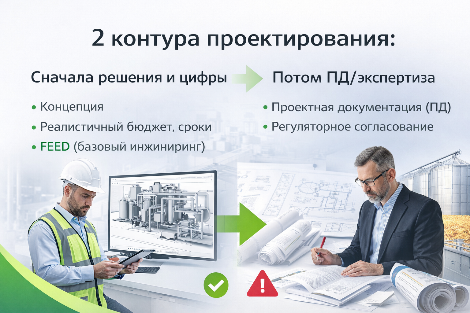 Выберите услугу: новый завод (Greenfield), модернизация (Brownfield), ПД по ПП №87 и экспертиза, "инженер инвестора" (Owner’s Engineer), запуск технологии и продукта? Работаем по шагам — чтобы решения и цифры были зафиксированы до ПД.