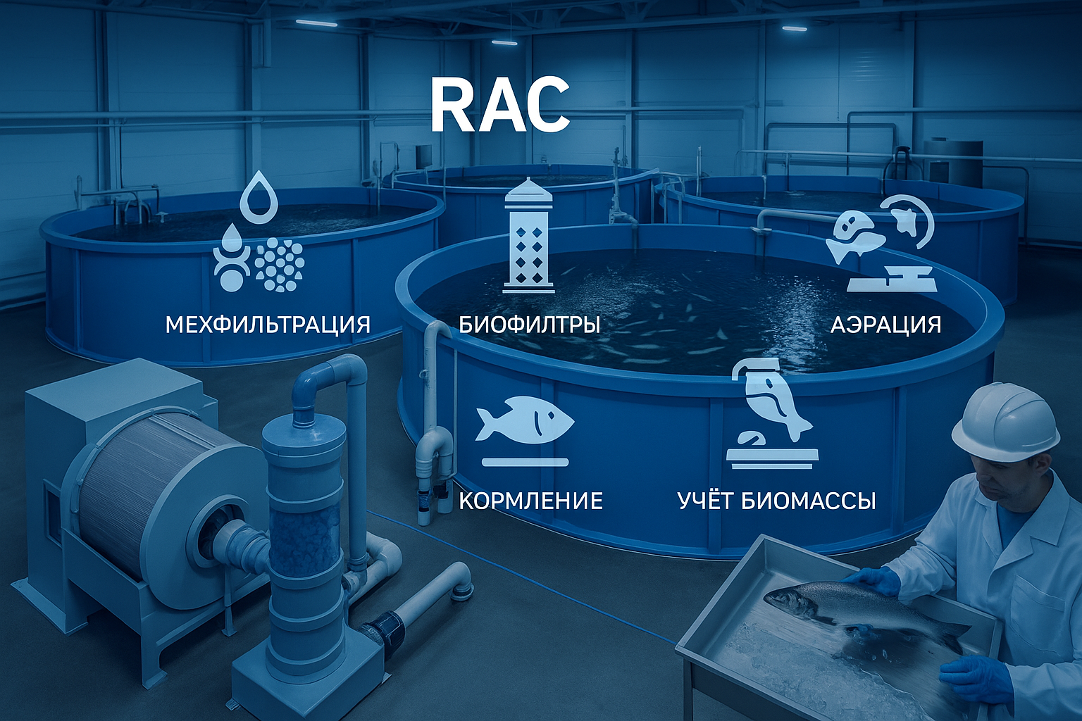 3. Аквакультура/РАС → мехфильтрация, биофильтры/нитрификация, дегазация/CO₂‑stripping, аэрация/кислород, кормление/учёт биомассы, предобработка/предохлаждение рыбы.